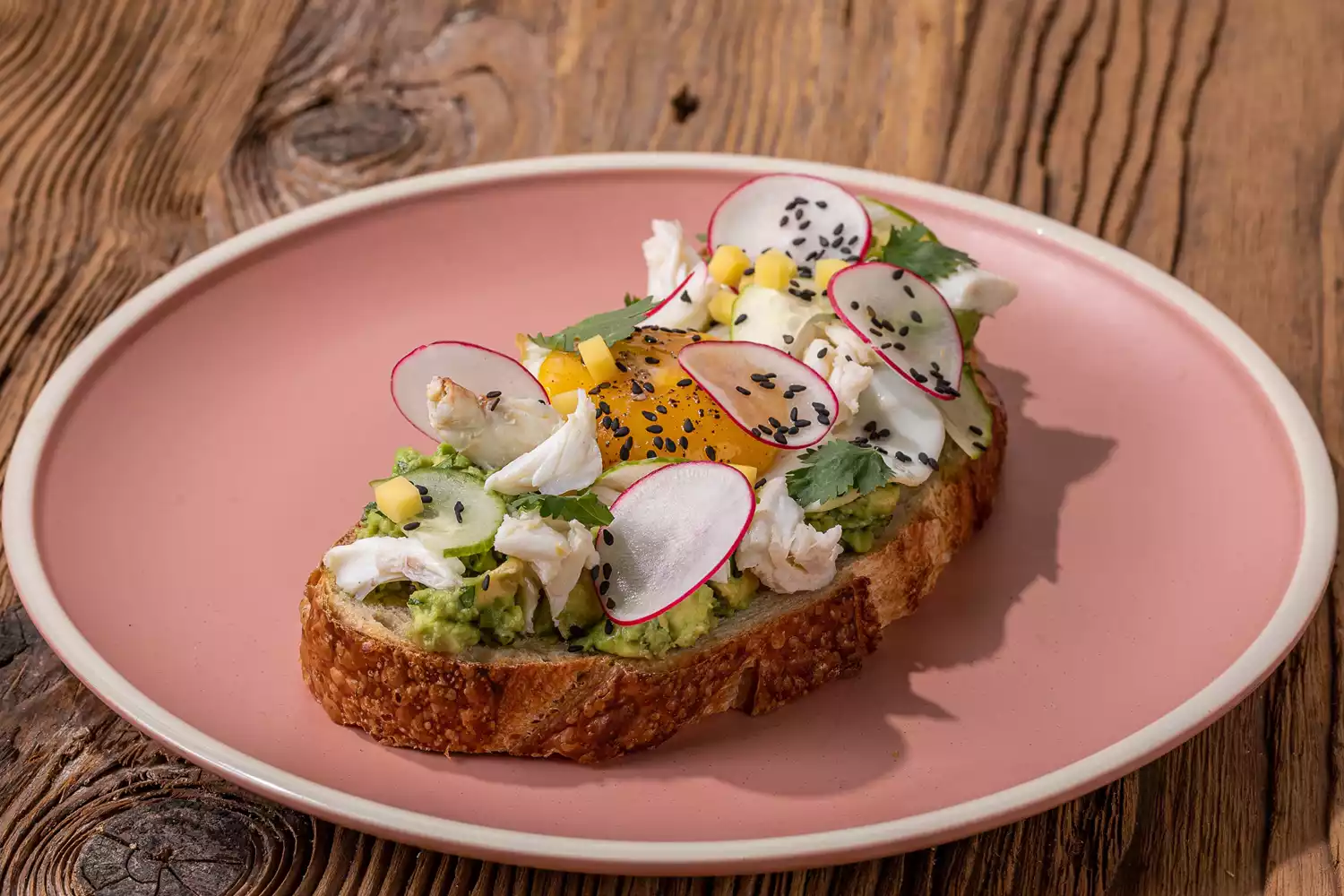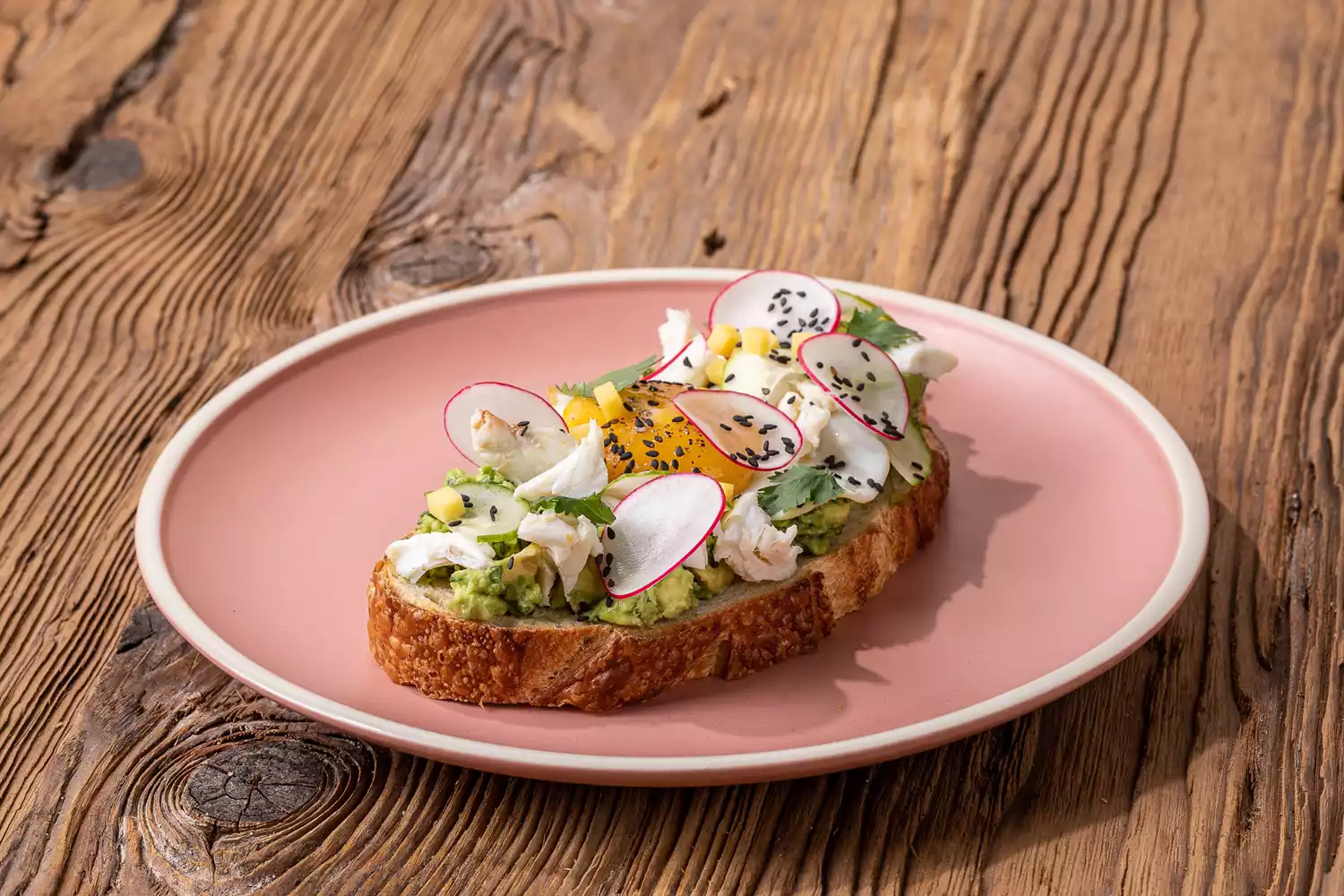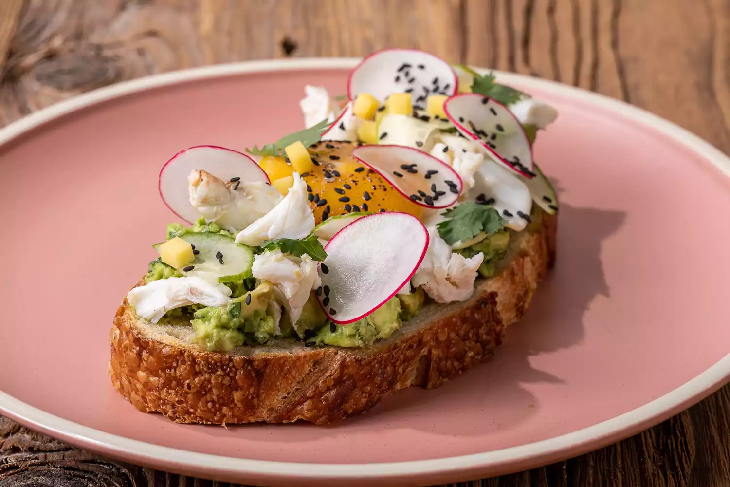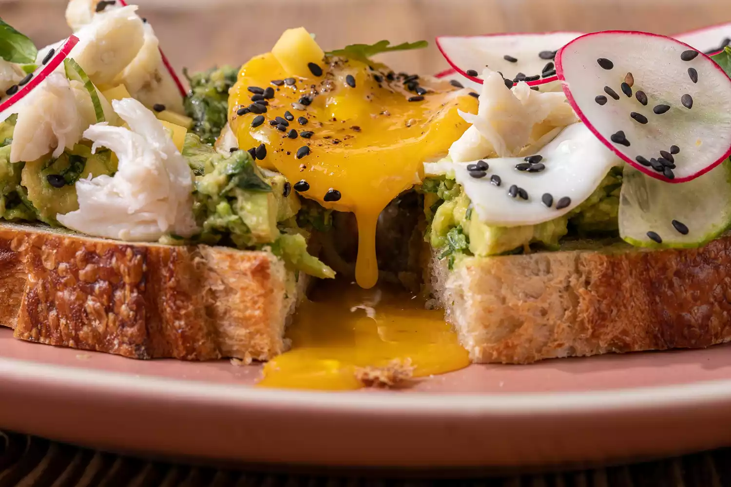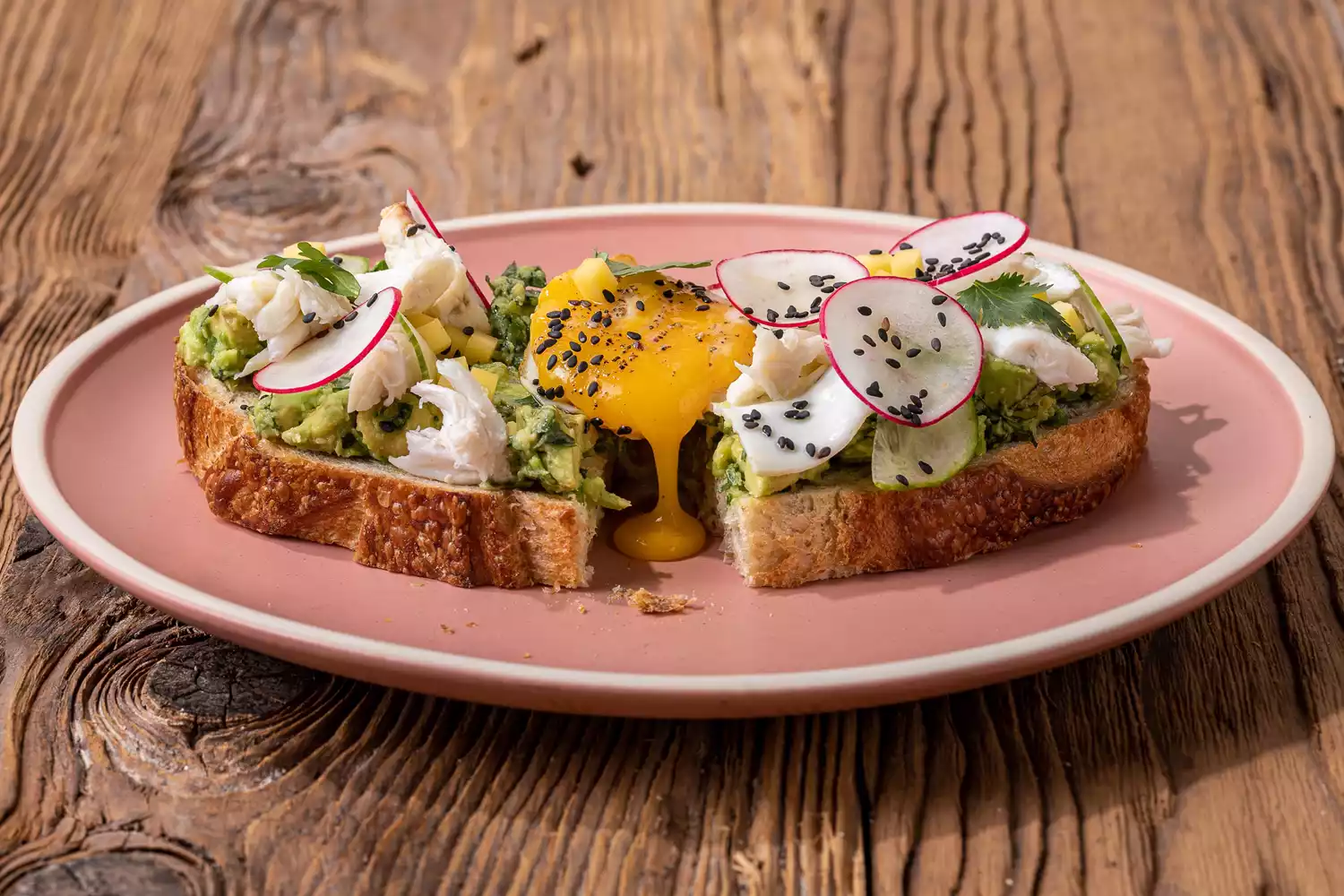 - Spread avocado on toast. Place cooked egg in center and garnish with crab meat, cucumber, radish, mango, sesame seeds, cilantro, and a drizzle of olive oil.