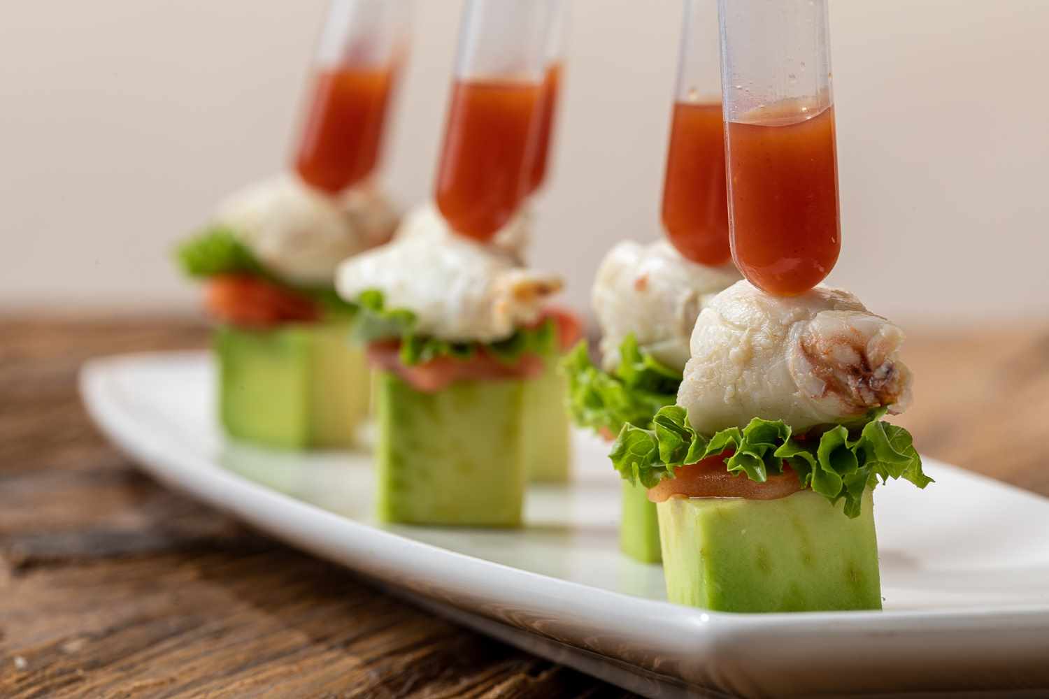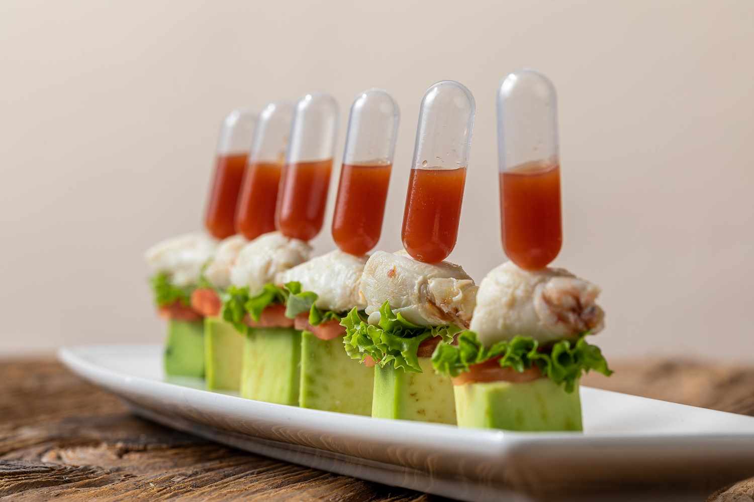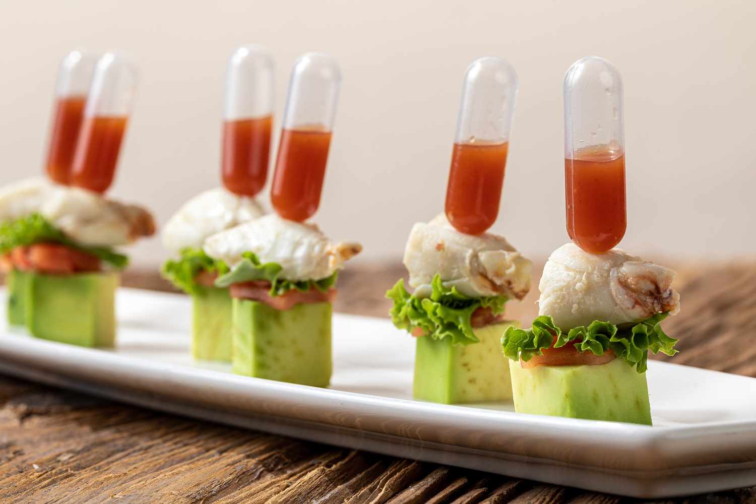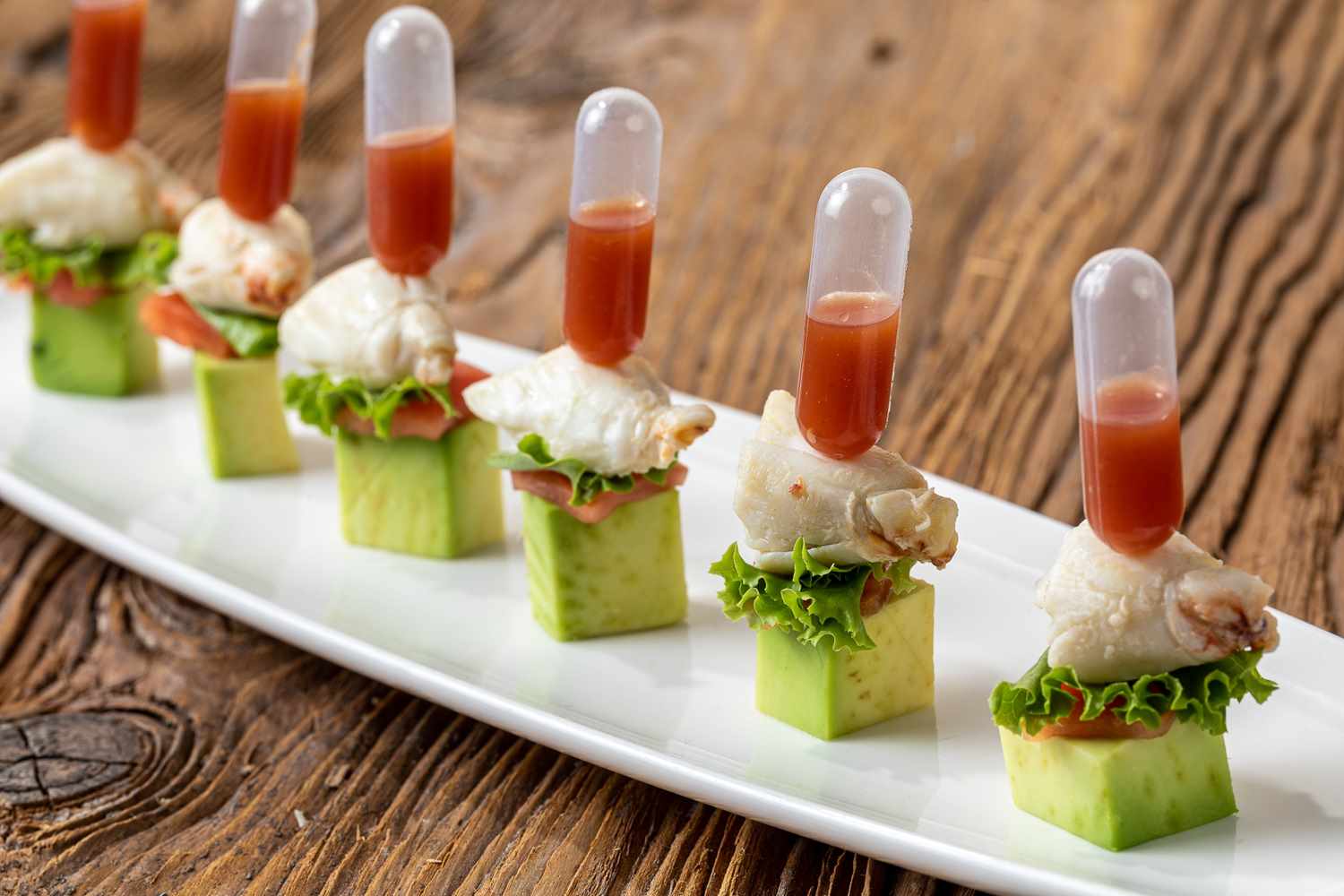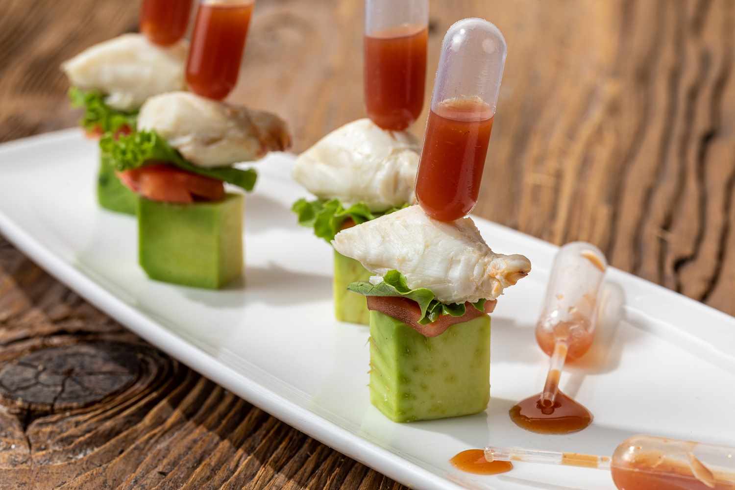 5. Build each pipette by layering with a piece of crabmeat, ripped lettuce, sliced tomato, and avocado. Serve immediately.