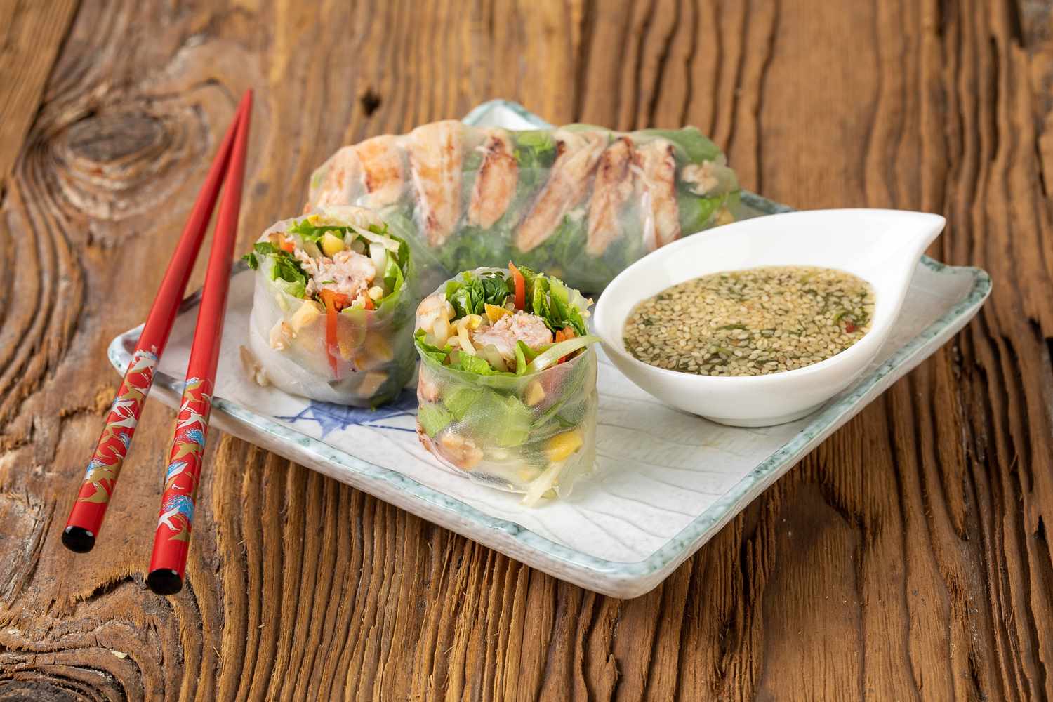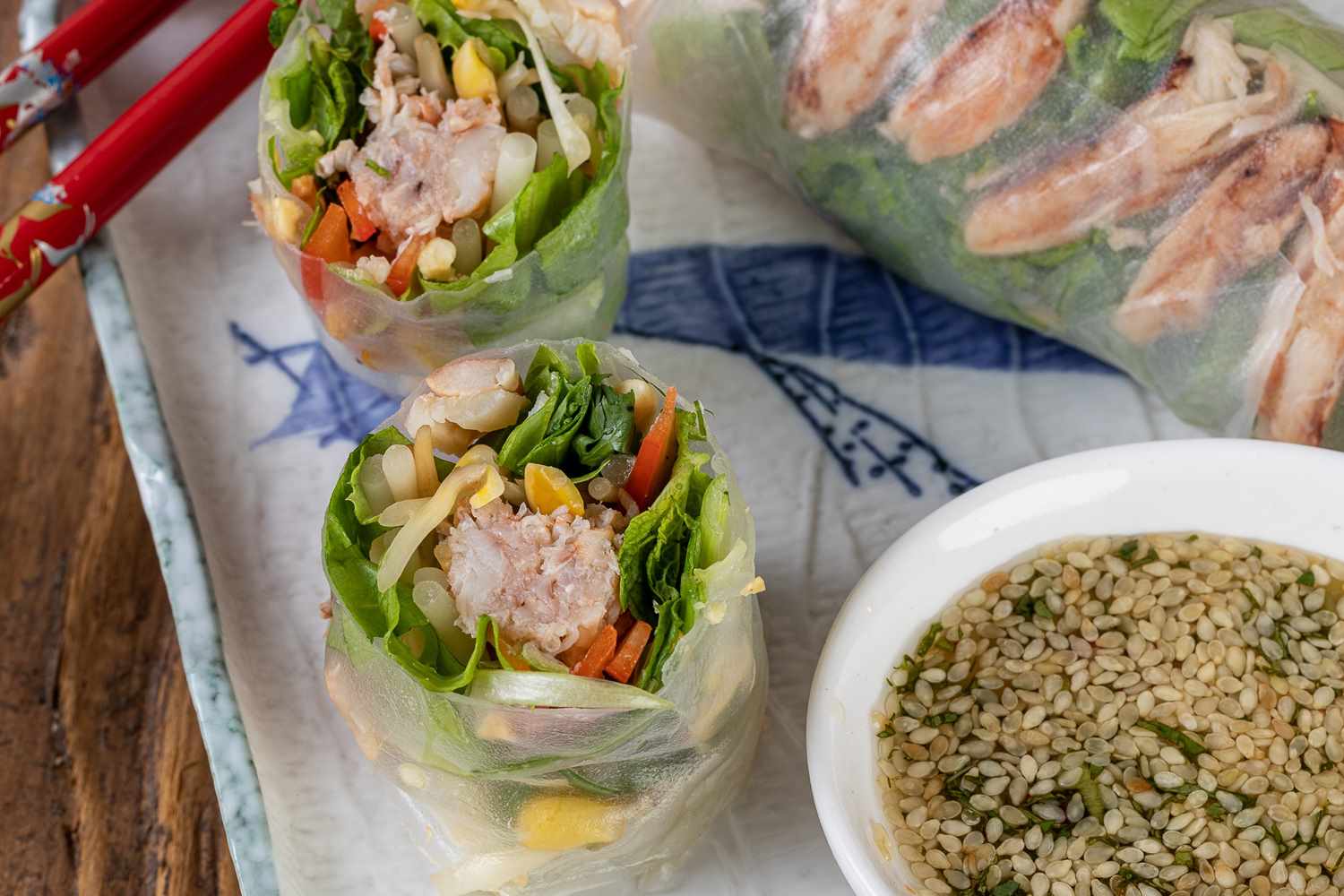 - Layer wrapper with crab, cucumber, lettuce, bean sprouts, torn herbs, scallions, and peanuts