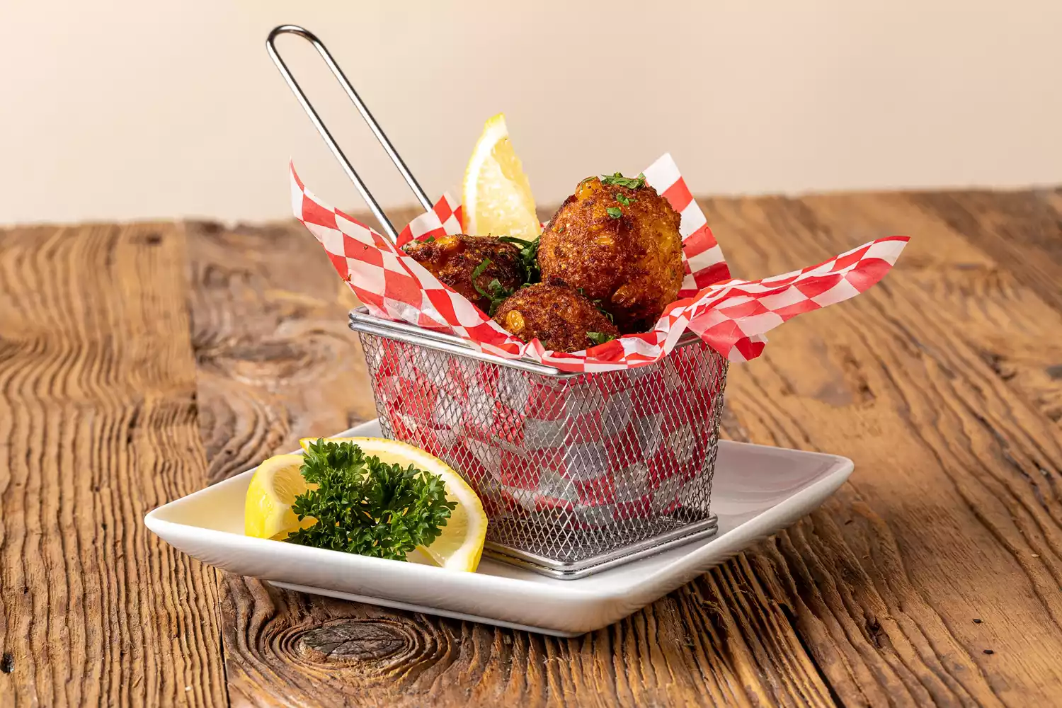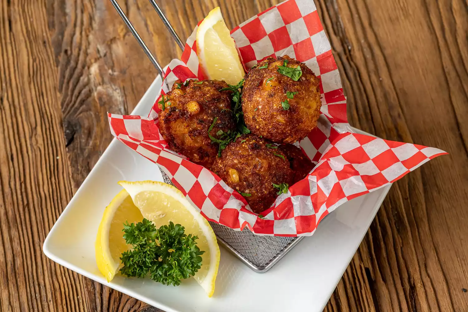 These crab jalapeño hush puppies bring a coastal twist to a Southern favorite. Sweet Heron Point jumbo lump crab meat blends with golden cornmeal, melted fontina, and a hint of heat from fresh jalapeños for the perfect bite-sized indulgence. Crispy on the outside and tender inside, each fritter delivers a balance of savory, sweet, and spicy flavors. Serve them hot with lemon wedges and parsley for an appetizer that disappears as fast as it hits the table.