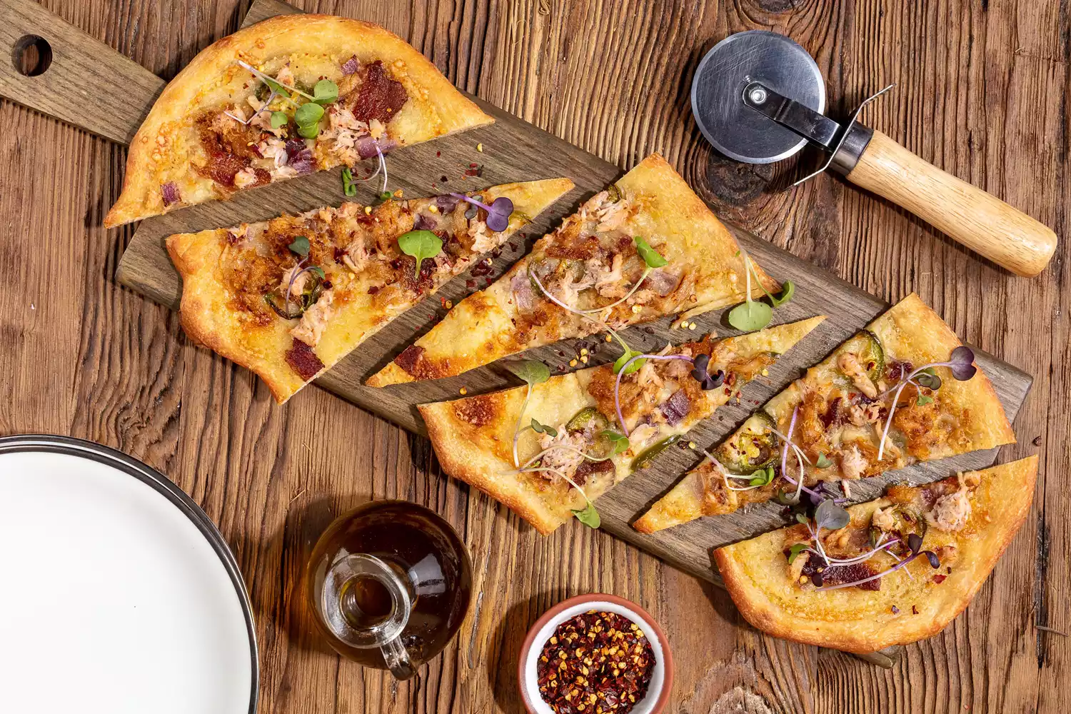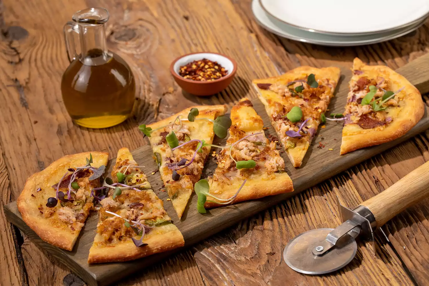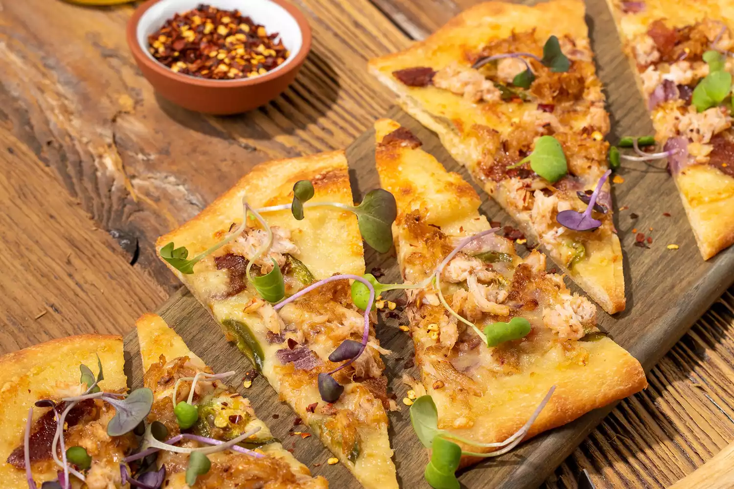 This crab and bacon flatbread brings together everything you crave in one bite — creamy, smoky, and just the right amount of heat. Crisp bacon and melted Gruyère create a savory base, while tender Heron Point crab meat adds a touch of sweetness that elevates every slice. A light béchamel sauce ties it all together, and the finish of jalapeño, micro herbs, and red pepper flakes gives each piece a bold, balanced kick. Perfect for sharing, this flatbread is as impressive for entertaining as it is easy for a weeknight dinner.