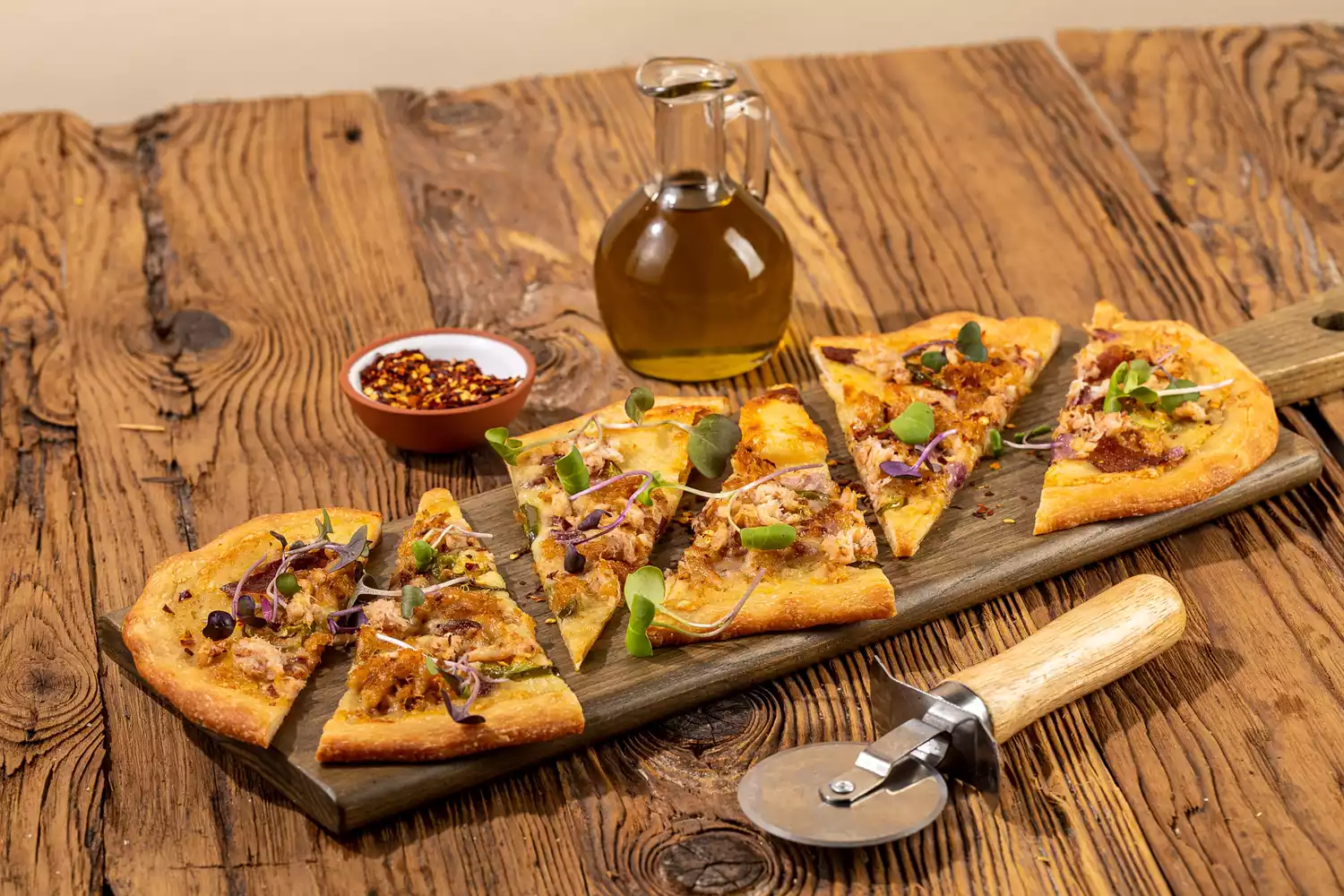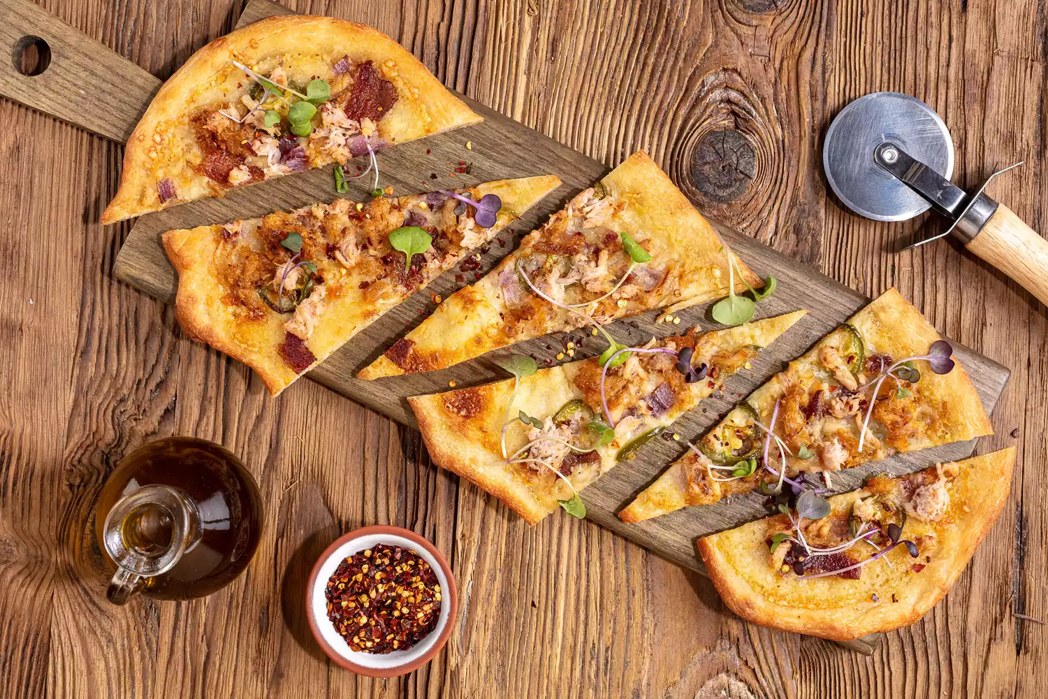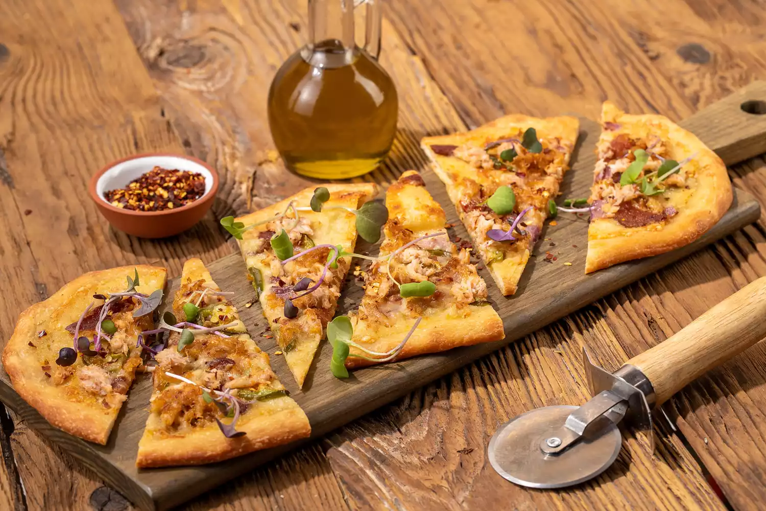 This crab and bacon flatbread brings together everything you crave in one bite — creamy, smoky, and just the right amount of heat. Crisp bacon and melted Gruyère create a savory base, while tender Heron Point crab meat adds a touch of sweetness that elevates every slice. A light béchamel sauce ties it all together, and the finish of jalapeño, micro herbs, and red pepper flakes gives each piece a bold, balanced kick. Perfect for sharing, this flatbread is as impressive for entertaining as it is easy for a weeknight dinner.