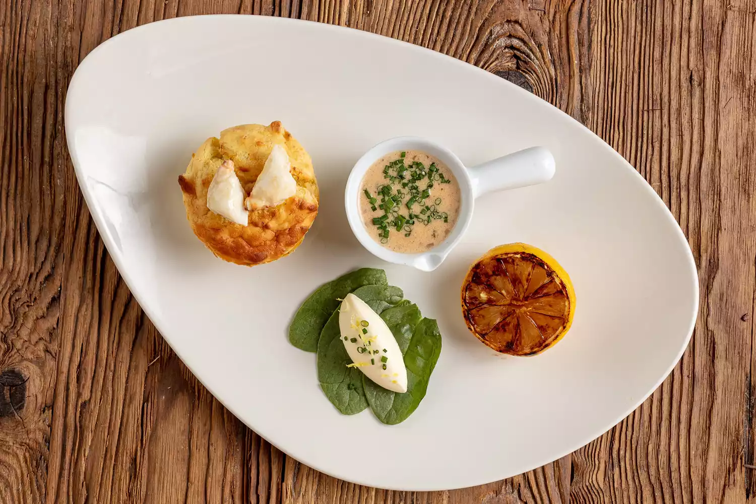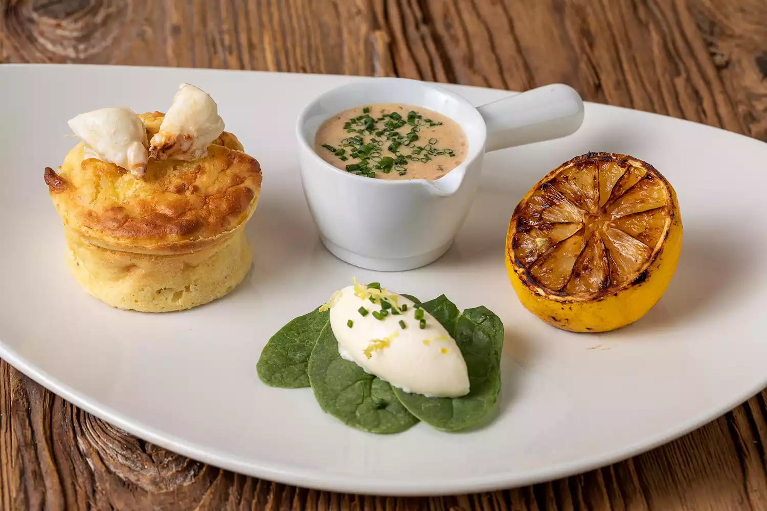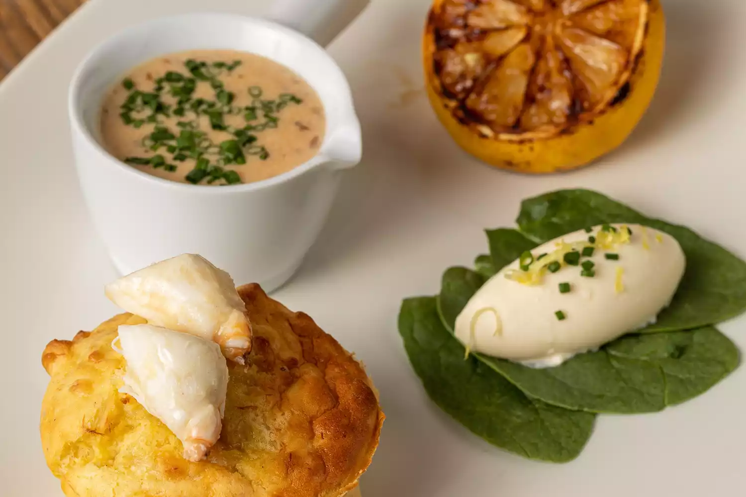 This twice baked crab soufflé is a true showpiece, light, creamy, and full of rich coastal flavor. Heron Point crab meat blends perfectly with a smooth goat cheese base, creating a dish that feels both luxurious and comforting. The soufflé is baked once for lift and again for a golden, delicate finish that melts in your mouth. Topped with a drizzle of sherry cream sauce and a squeeze of charred lemon, it’s a dish that brings elegance and warmth to any table.