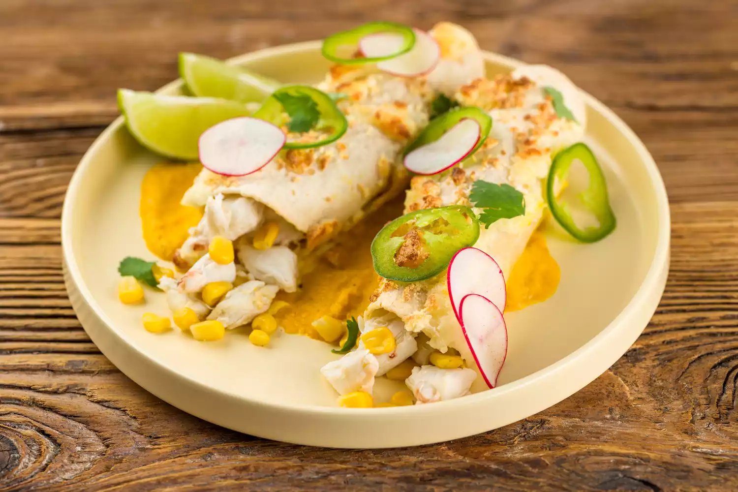 These Baja crab enchiladas are rich, creamy, and full of vibrant coastal flavor. Sweet Heron Point crab meat blends with roasted peppers, fresh corn, and melted cheese, then gets wrapped in warm tortillas and baked until golden. A silky yellow mole sauce adds depth with notes of lime, coriander, and a hint of spice, tying every element together beautifully. It’s a fresh twist on a Mexican favorite that brings the taste of the sea straight to your table.