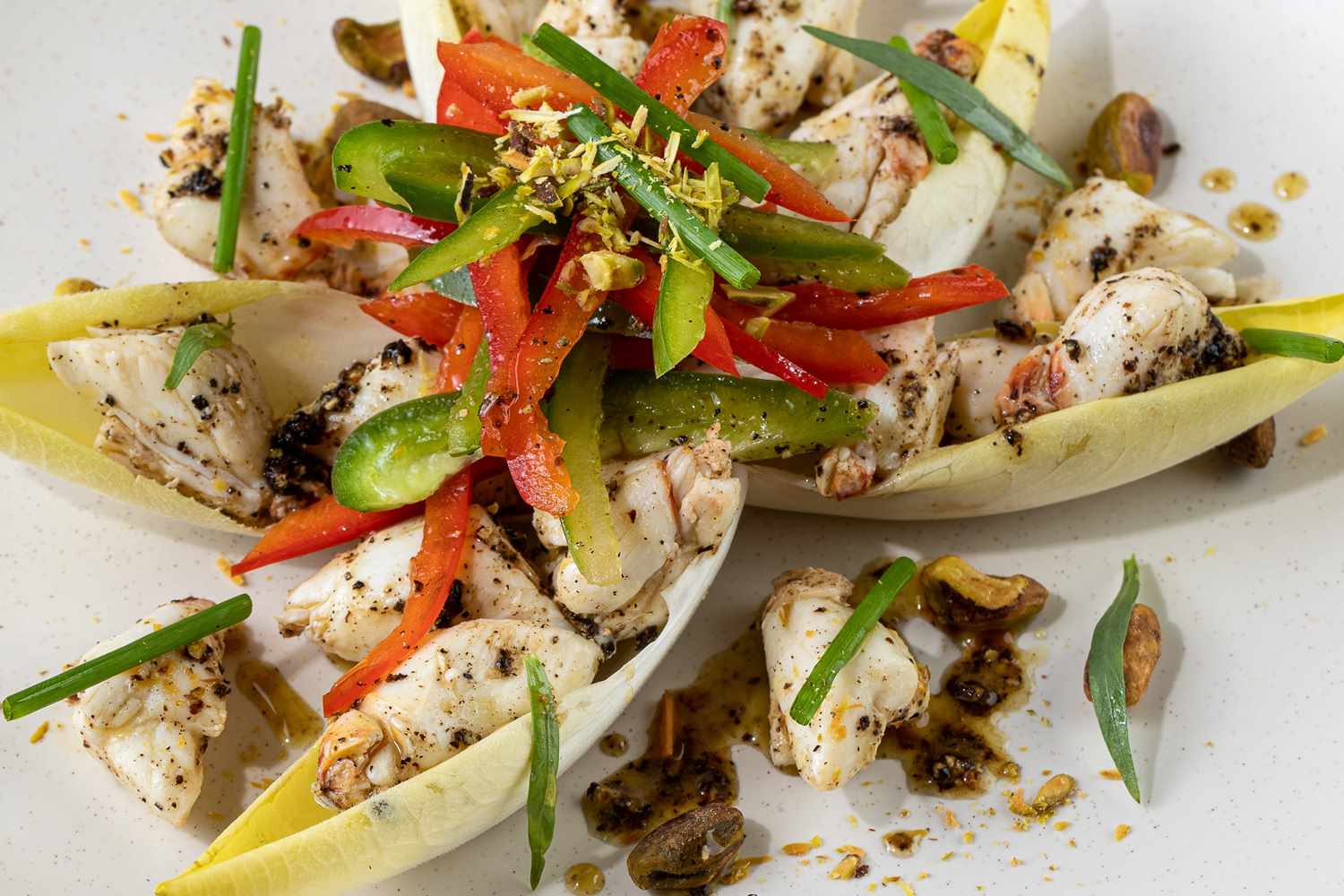 - Plate salad by layering endive, crab, and peppers. Top each salad with chopped pistachios and drizzle with remaining vinaigrette