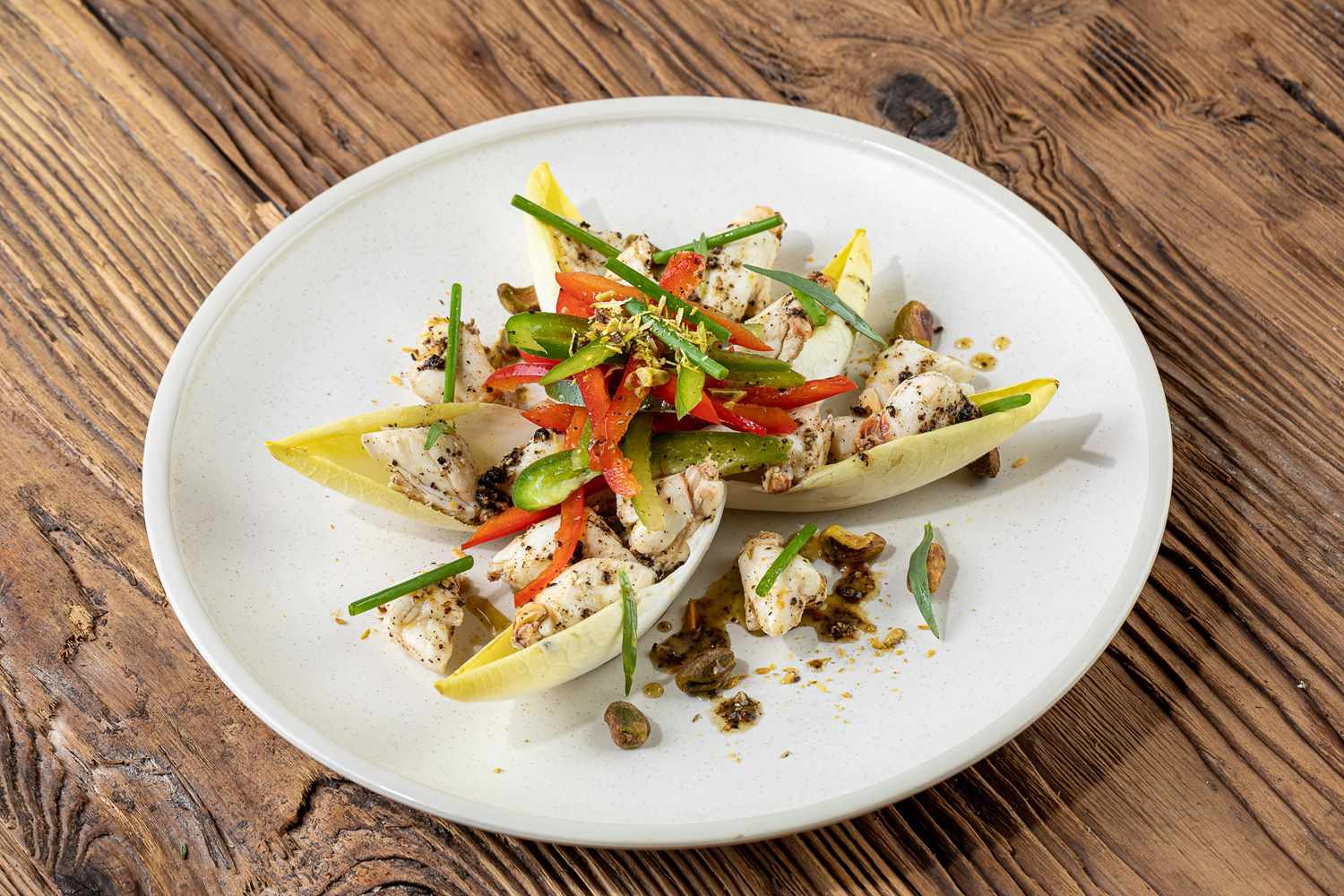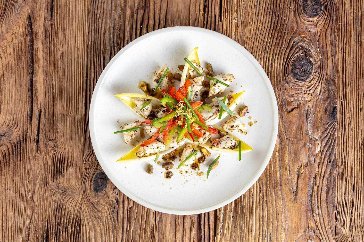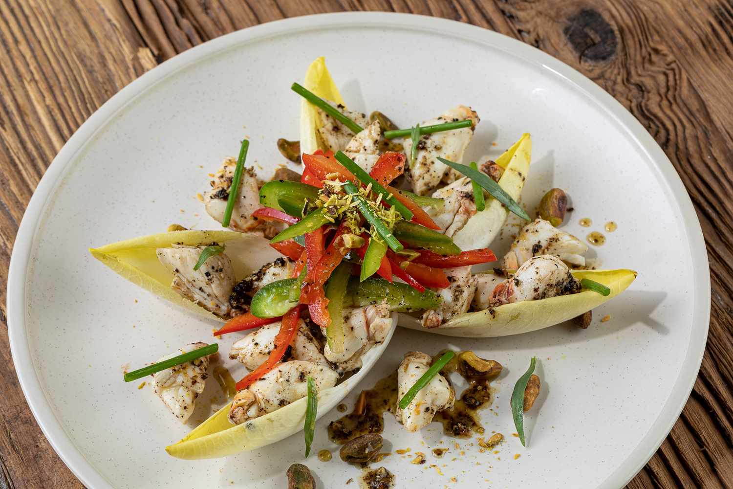 Crab Hoelzel is a refreshing, elegant salad that balances the sweetness of Heron Point crab with crisp vegetables and a fragrant tarragon vinaigrette. Crunchy Belgian endive and colorful bell peppers bring brightness and texture, while crushed pistachios add a subtle nuttiness in every bite. The light herbal dressing ties it all together, creating a dish that feels both refined and effortlessly fresh. It’s perfect as a summer starter or a light, sophisticated lunch.
