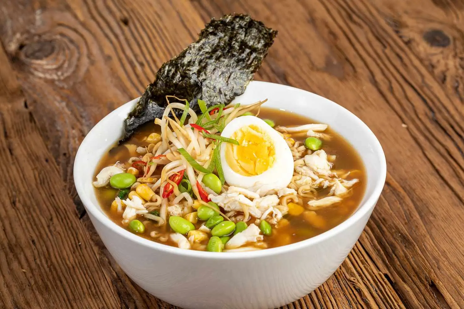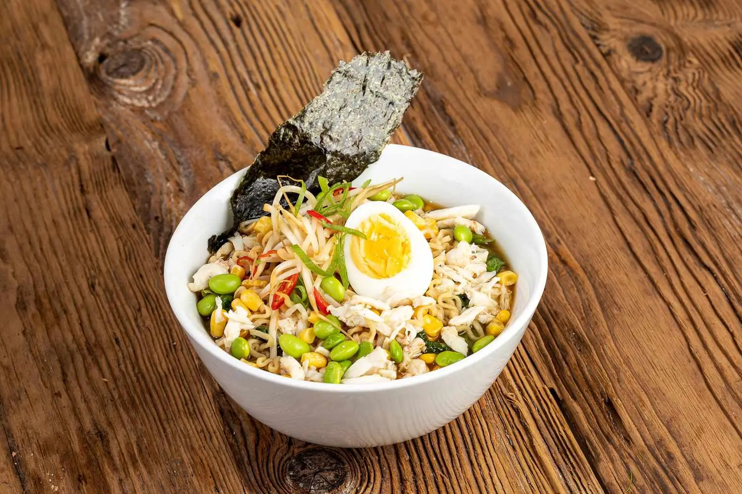 - Garnish each bowl of ramen with Edamame, Scallions, Hard Boiled Eggs, Bean Sprouts, Shredded Nori and Fresno Chili