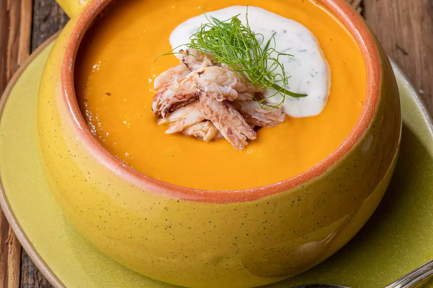 - Garnish each bowl of bisque with a scoop of tarragon crème fraiche, reserved crab meat and fennel fronds