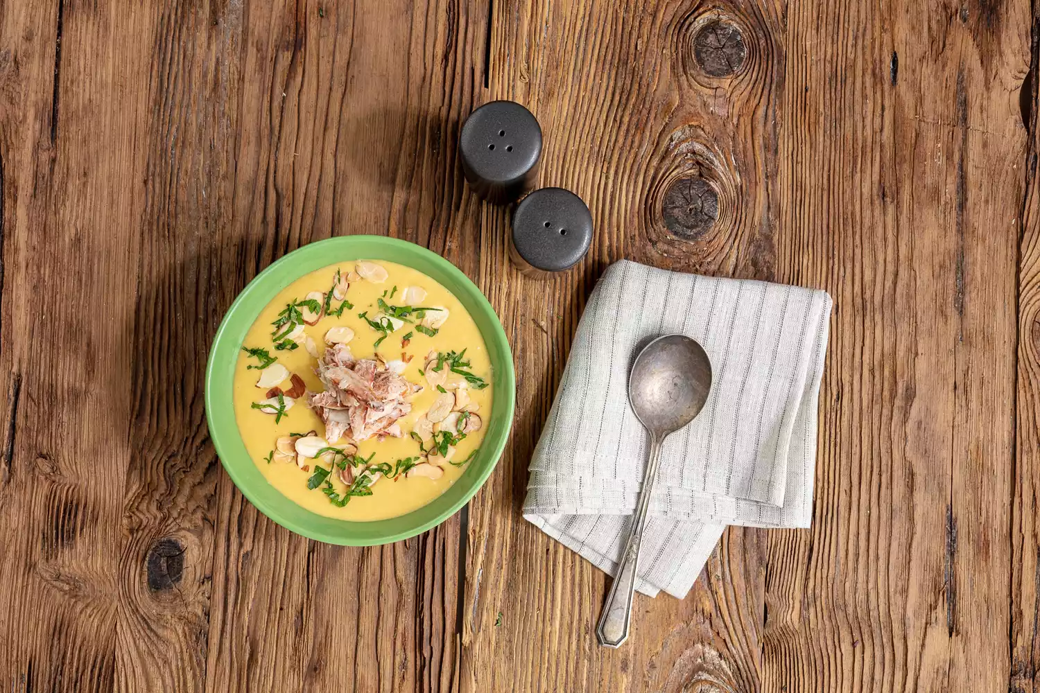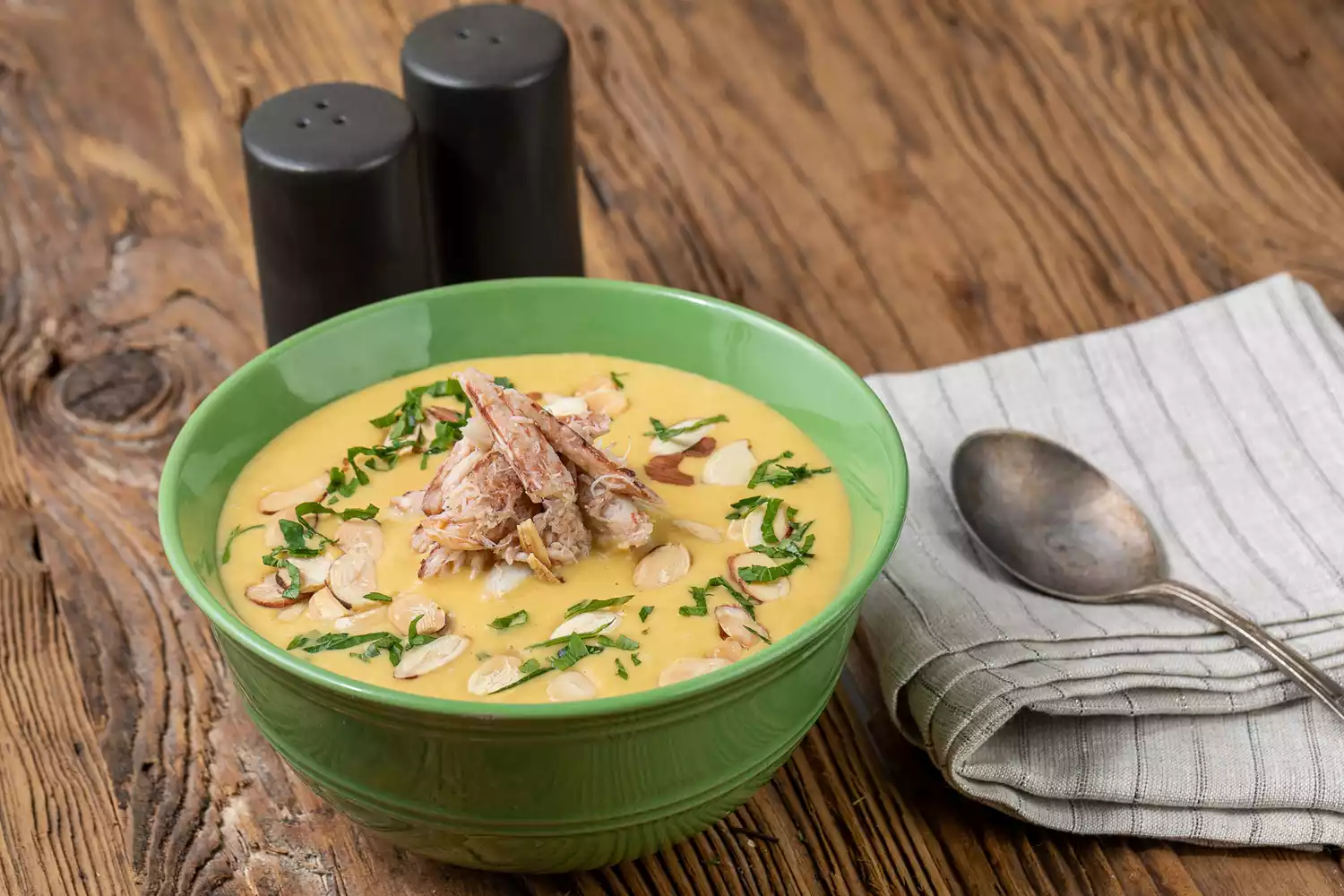 - Portion in bowls and serve with crab meat, parsley, and toasted almonds