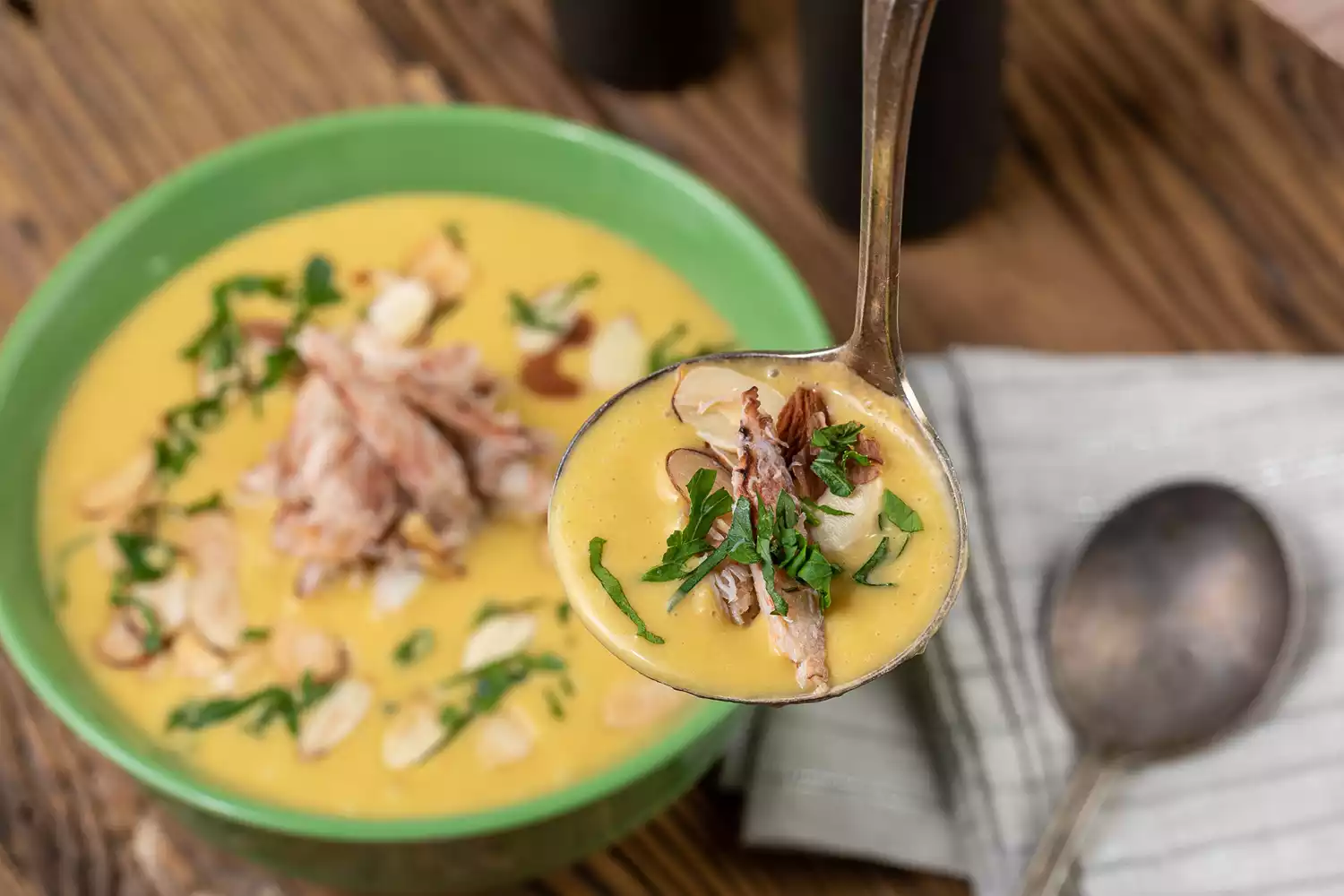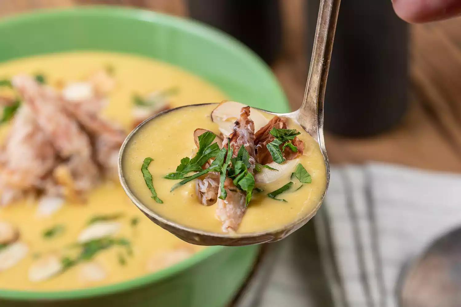 This Butternut Squash and Crab Bisque is smooth, comforting, and full of coastal flavor. Sweet roasted squash blends with cream, butter, and a hint of ginger to create a velvety base that perfectly complements delicate Heron Point crab meat. Toasted almonds add a subtle crunch, while fresh parsley brightens every spoonful. It’s a refined twist on a fall favorite—rich, balanced, and deeply satisfying.